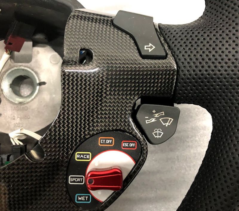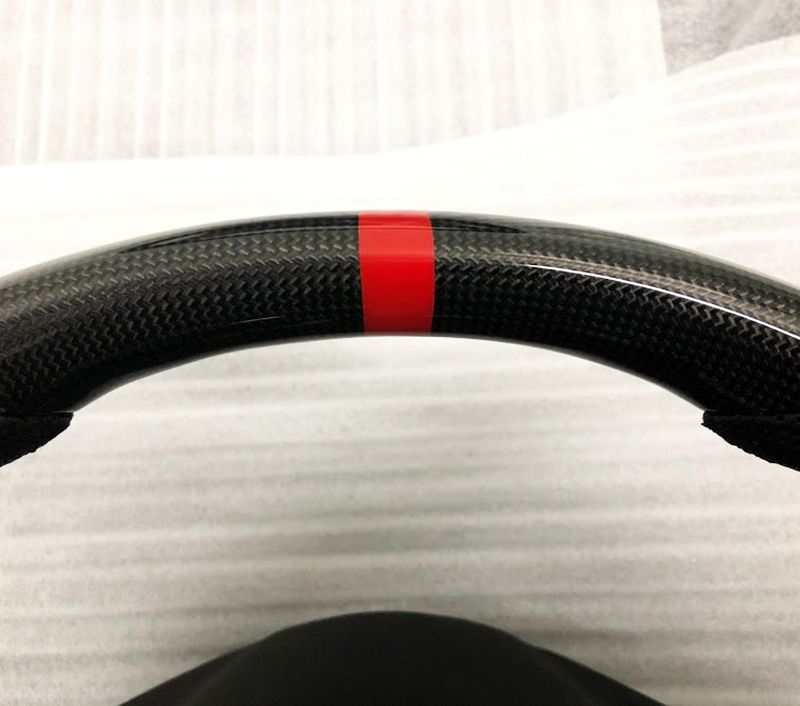 This part has been customized by adding a red 12 o'clock stripe, includes black stitching (to fit most vehicle), we included a new manettino sticker and it will complement the exisiting carbon fiber interior of your vehicle. .