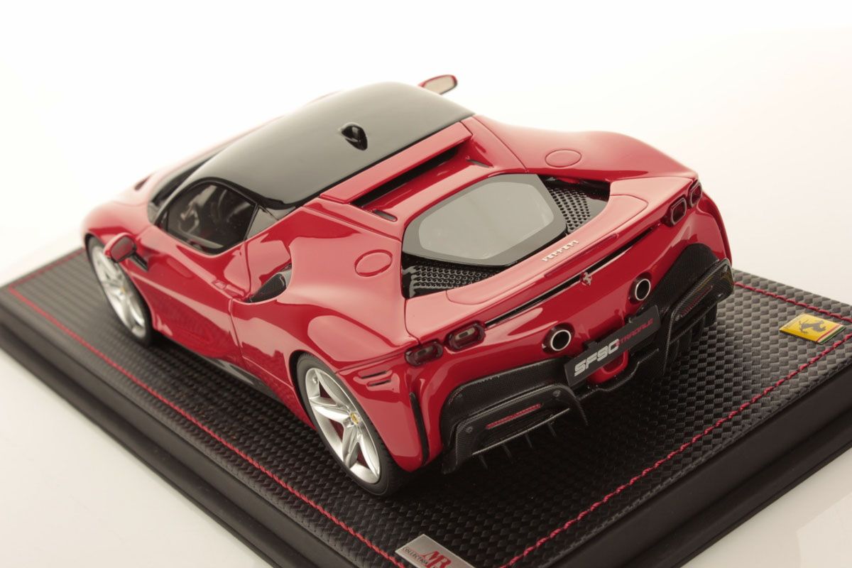 The Limited Edition Ferrari SF90 Stradale Rosso Corsawith the roof Nero DS 1250 is made from MR Collection - FE028A . This model is sold with the base and display case.