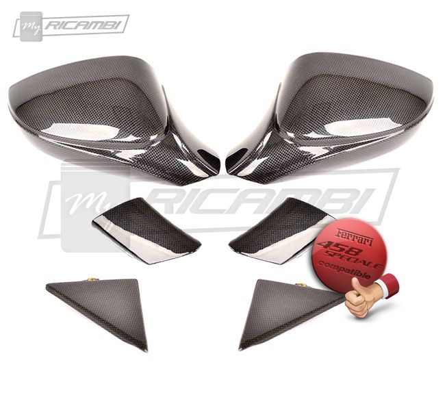 These Carbon Fiber Mirrors and Outside Door Corners (or exterior triangles) are made to fit all Ferrari 458 Models, including the Ferrari 458 Speciale. They are the perfect replacement for the plastic one currently in your Ferrari.